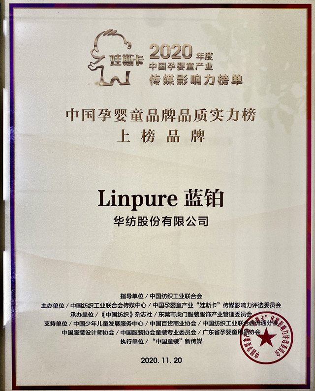 日前,公司Linpure藍(lán)鉑品牌既獲“娃斯卡”2019年度中國(guó)孕嬰童品牌暖心實(shí)力榜后,再獲中國(guó)孕嬰童產(chǎn)業(yè)“娃斯卡”傳媒影響力評(píng)選委員會(huì)頒發(fā)的2020年度中國(guó)孕嬰童品牌品質(zhì)實(shí)力大獎(jiǎng)。