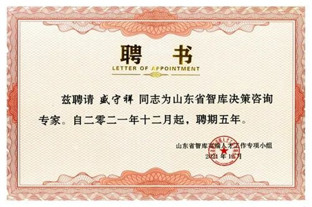 導讀:近日,接山東省智庫高端人才工作專項小組辦公室通知,公司董事長盛守祥入選2021年山東省智庫高端人才,獲聘經濟建設領域山東省智庫決策咨詢專家。