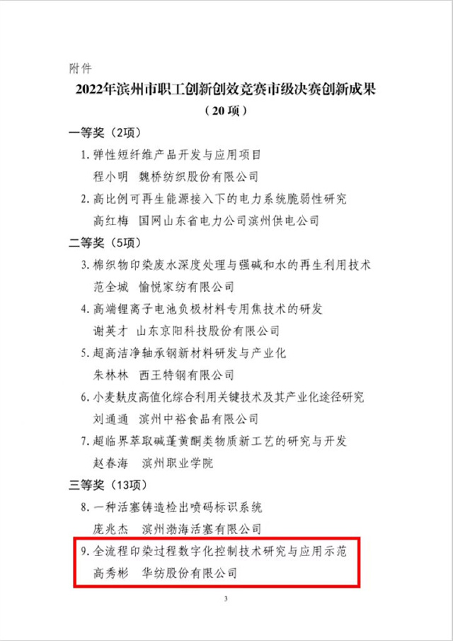 近日,濱州市總工會下發(fā)了《關于公布2022年濱州市職工創(chuàng)新創(chuàng)效競賽市級決賽創(chuàng)新成果名單的通知》。公司由信息互聯(lián)部軟件開發(fā)組主管高秀彬組織開發(fā)的“全流程印染過程數(shù)字化控制技術研究與應用示范”項目榮獲三等獎。