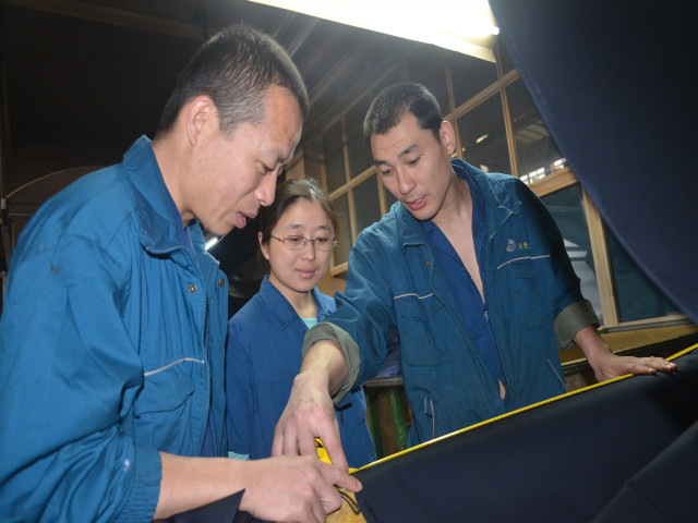 圖為面一車間甲班班長孟繁強(qiáng)(左)、組長孫新強(qiáng)(右)、出檢劉丙娟,在查看當(dāng)班下機(jī)產(chǎn)品的質(zhì)量情況。